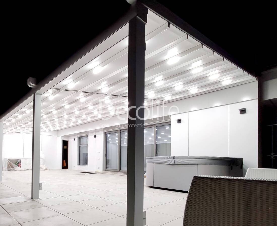 Преимущество биоклиматических пергол заключается в актуальности при любой погоде. Если идет дождь, плотно прилегающие ламели закрытой крыши отлично защитят от влаги. Когда светит солнце, через герметичные элементы ни один лучик не проникнет на террасу. А при благоприятных условиях ламели можно открыть.